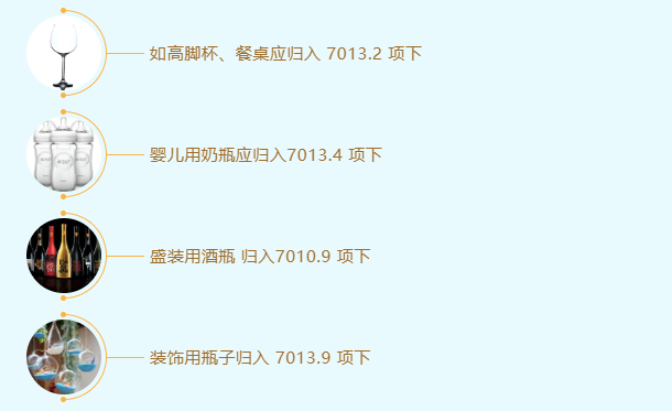 常见的玻璃器皿如“高脚杯”属于品目70.13具体列名商品,“婴儿奶瓶”出现在品目70.13注释对商品的具体举例中,装饰用“酒瓶”符合品目70.13要求,三类商品均应归入品目70.13,再根据材质确定其子目。